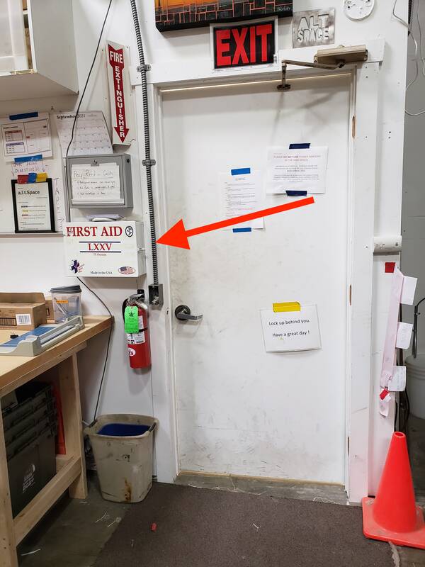 There is a larger first aid box in the main space with smaller ones in woodshop and metalshop.